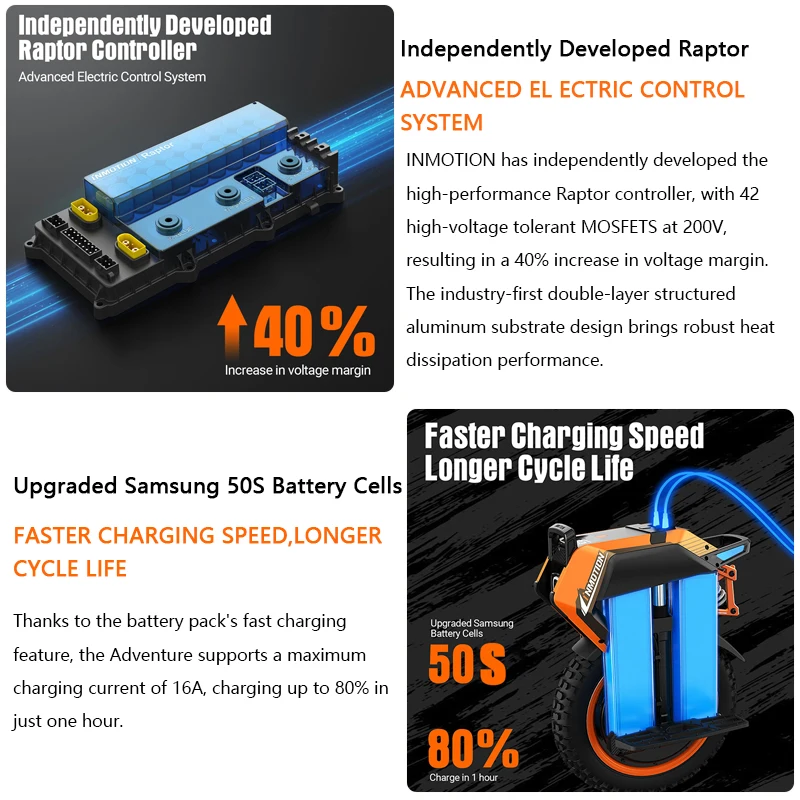 INMOTION has independently developed the high-performance Raptor controller, with 42 high-voltage tolerant MOSFETS at 200V, resulting in a 40% increase in voltage margin. The industry-first double-layer structured aluminum substrate design brings robust heat dissipation performance.