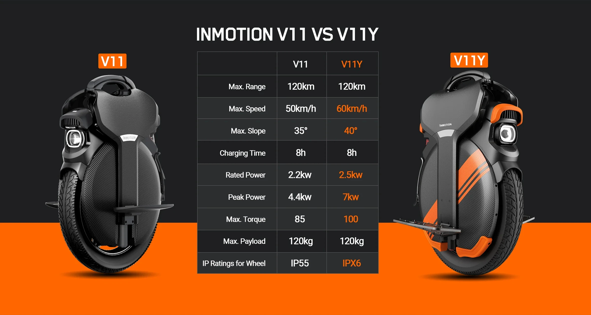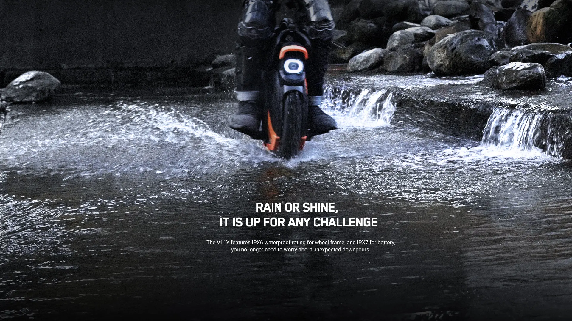 The V11Y features lPX6 waterproof rating for wheel frame, and lPX7 for battery,you no longer need to worry about unexpected downpours.