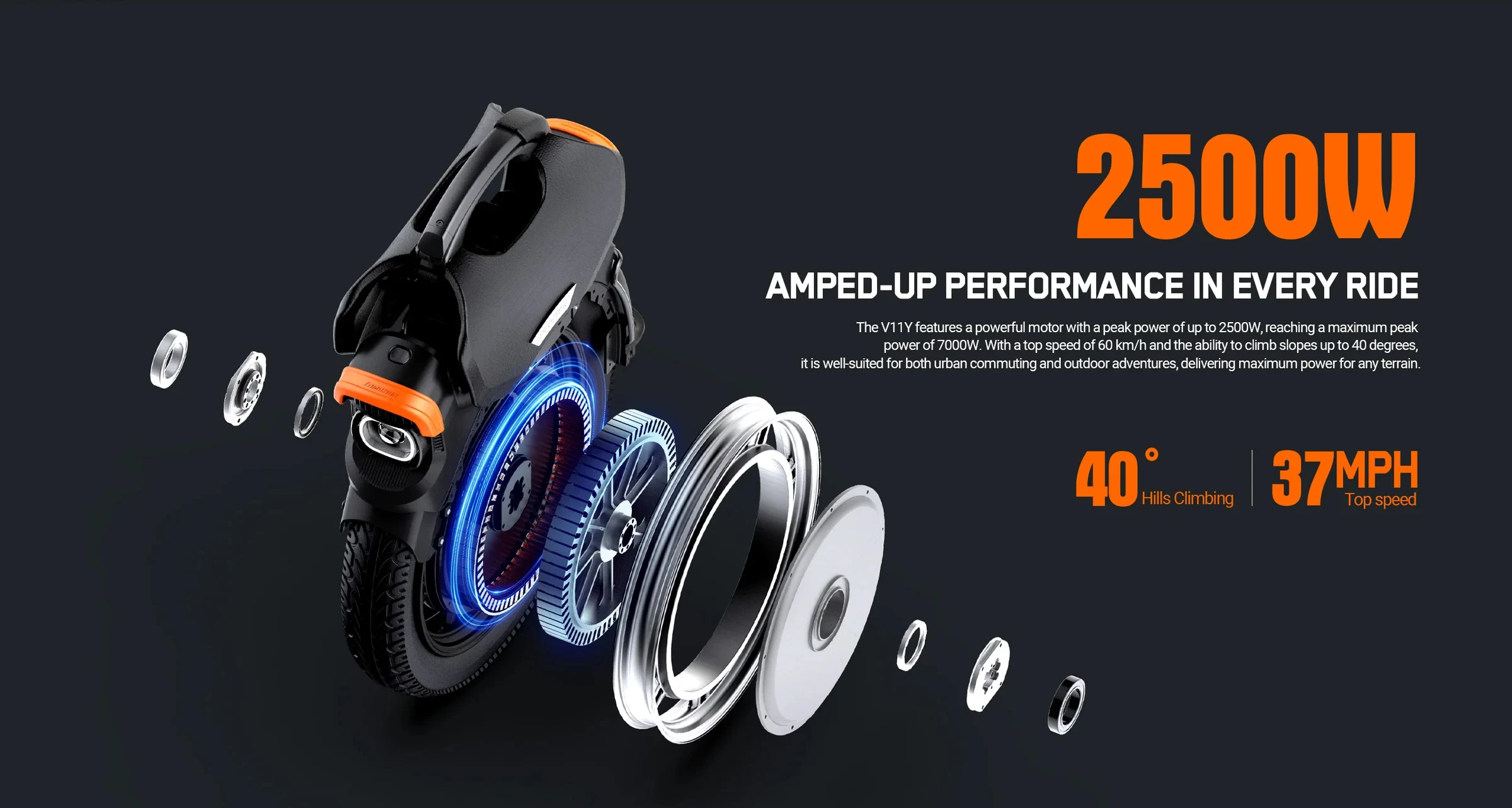 The V11Y features a powerful motor with a peak power of up to 2500W, reaching a maximum peak power of 7000W. With a top speed of 60 km/h and the ability to climb slopes up to 40 degrees,it is well-suited for both urban commuting and outdoor adventures,delivering maximum power for any terain.
