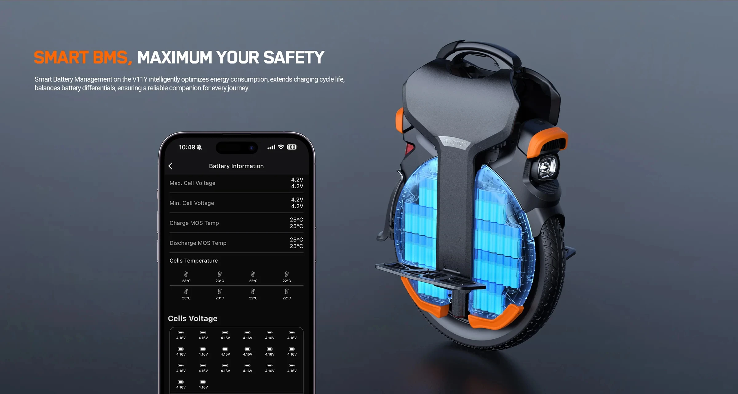 Smart Battery Management on the V11Y iellient optimizes energy consumption, extends charging cycle life,balances battery differentials, ensuring a reliable companion for every joumey.